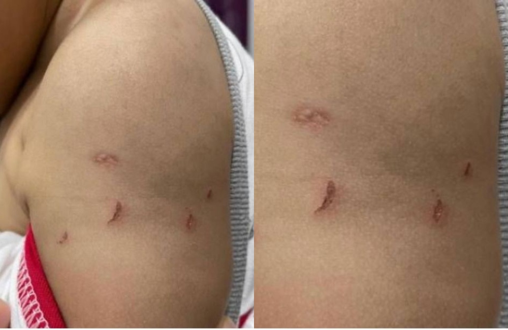 Menurut perkongsian di media sosial, wanita tersebut mendakwa kesan luka yang dilihat pada lengan anaknya menyerupai cengkaman kuku yang agak dalam sehingga menampakkan lapisan kulit berwarna kekuningan.