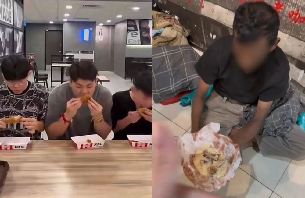 Menerusi rakaman yang tular di media sosial, individu-individu terbabit dilihat membeli makanan dari restoran makanan segera, namun kemudian memakan ayam goreng tersebut sebelum membungkus sisa tulang ayam bersama nasi untuk diberikan kepada seorang gelandangan yang sedang berbaring di kaki lima.